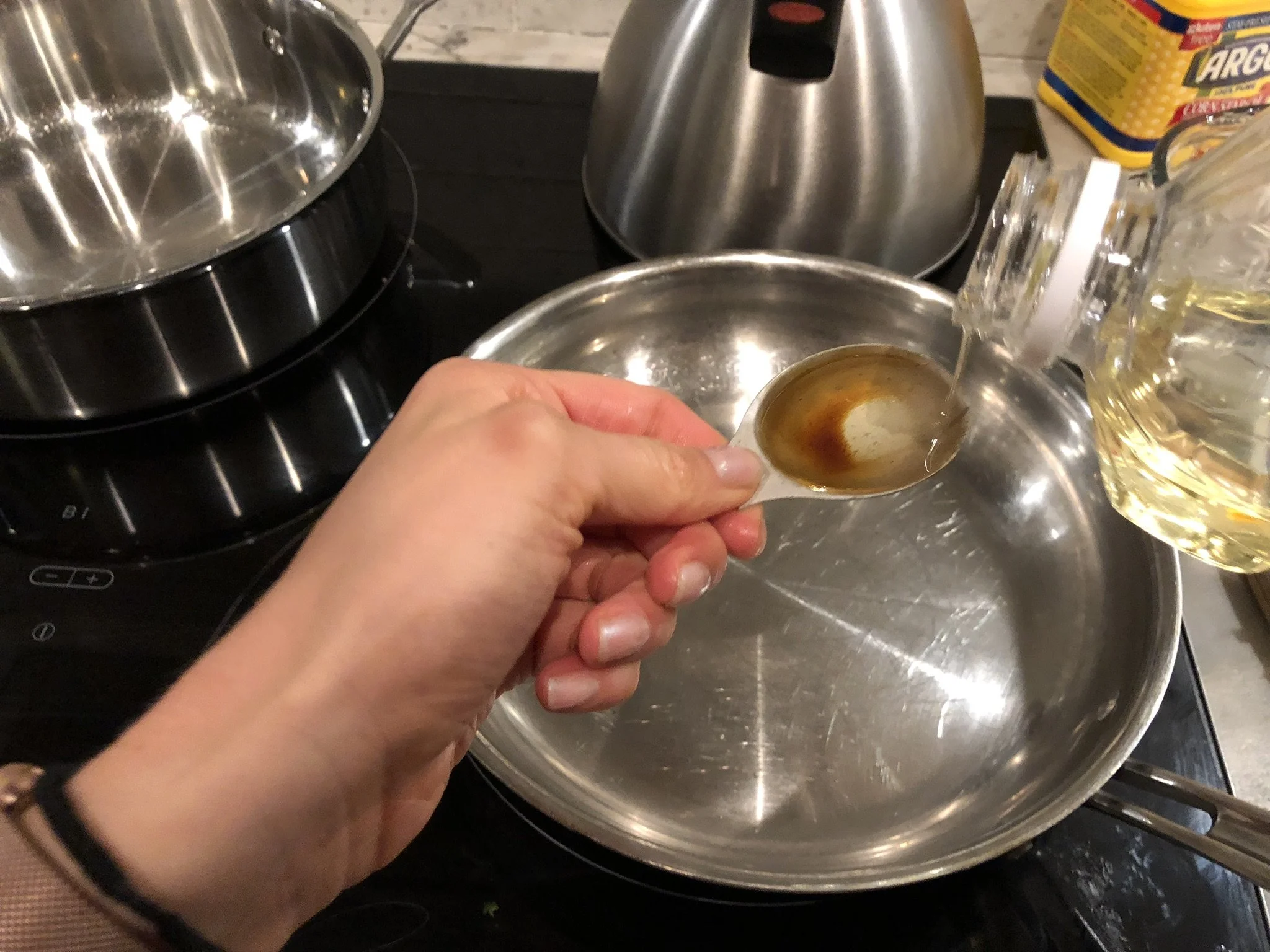 Heat the vegetable oil on medium-high in a deep, large frying pan or wok. My mom always uses a wok, but I don’t own one yet so I went for whatever pan I had on hand and it worked just fine. You just have to be more careful to scrape the corners of a regular frying pan.