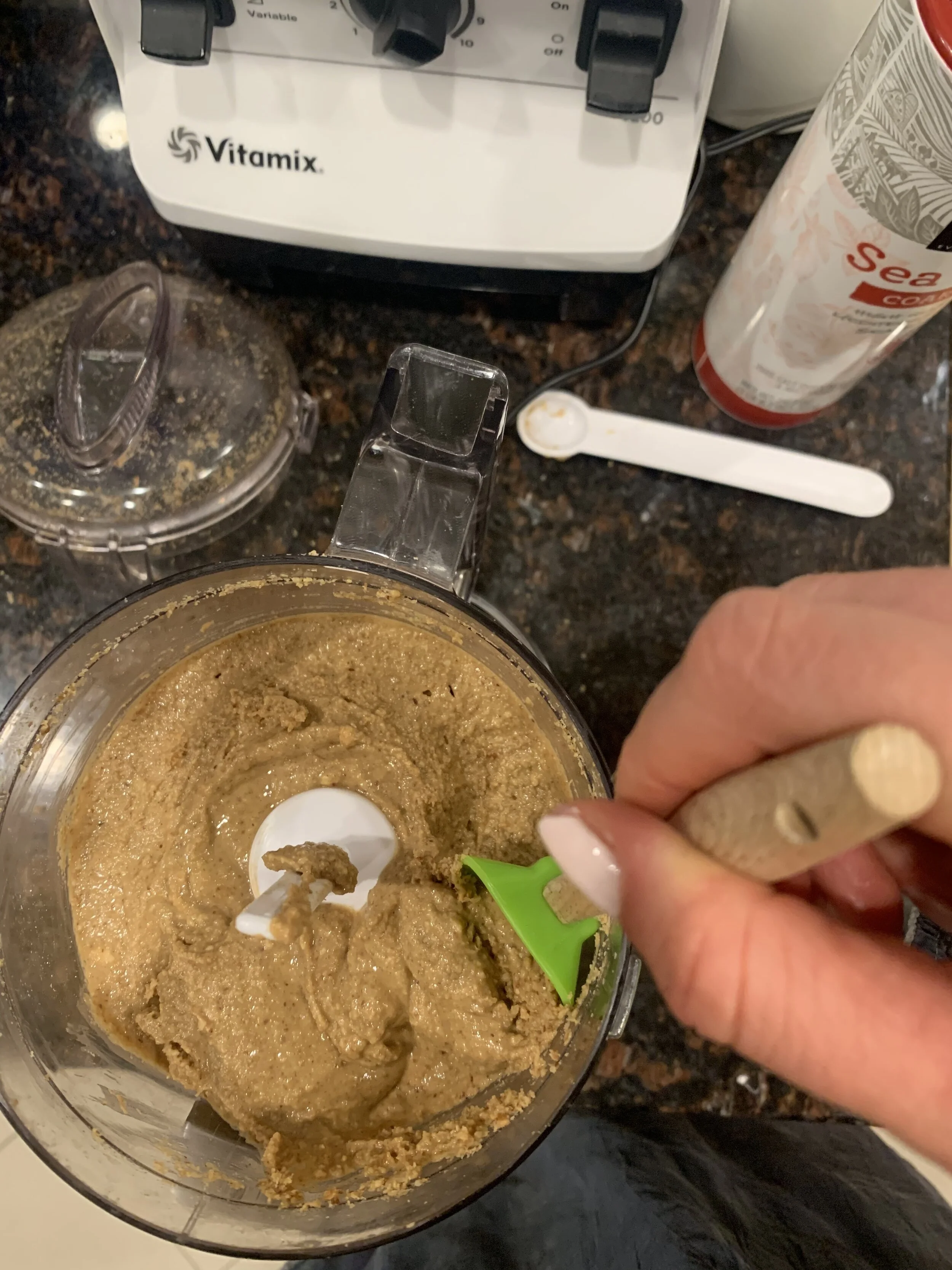 As the nuts begin to release their oil, the nut mixture will begin to look more like nut butter! Scrape sides to make sure everything blends evenly.
